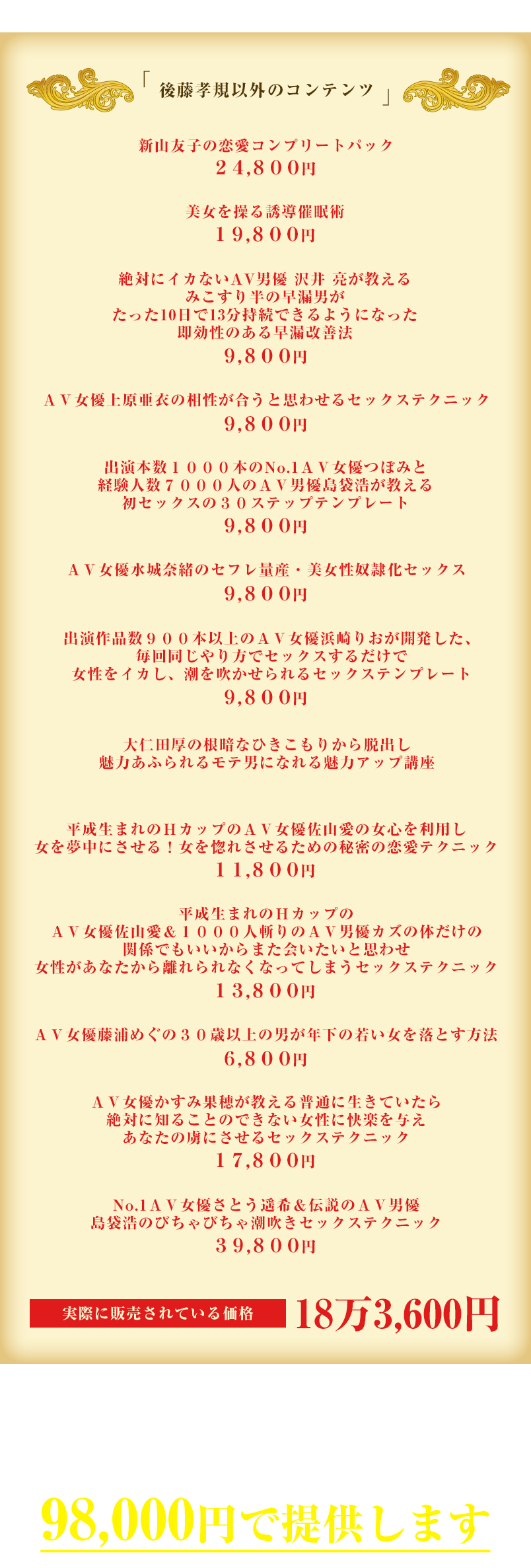 というのも、後藤孝規マンツーマン恋愛塾に参加していただいたあなたには確実に 女に不自由しない人生を送ってもらいたいというのもありますし、 この恋愛業界から私も足を洗う予定なので、 最後に81%オフのフルパッケージで提供させていただくことにしました。